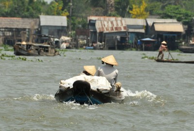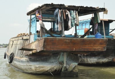 I had misjudged the time it’d take from Ho Chi Minh to Hoi An by train or bus (about 20 hours) so we decided to fly. This gave us one extra day in Ho Chi Minh. At the travel show we saw beautiful pictures of the floating markets so decided to try it out. It was an amazing day, even if it was another tour. It started with the usual drive from hotel to hotel to hotel then headed out of the city to the Mekong River where we caught an old wooden boat. It slowly made its way through a floating market but my favourite ever! It didn’t sell to tourists. It was an actual local floating market. On the tops of boats selling stuff was a bamboo pole and tied to it was what that boat sold. So pumpkins, carrots, mangos etc. were flapping like flags. Simple and cheap yet effective advertising. They even had a floating “corner store” selling pop and chips and cigarettes.