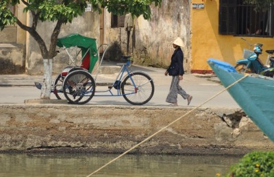 Once in Danang we needed to get to Hoi An. This meant more bartering for transportation. We finally decided on a cab to the local bus station which was 6 km away. A German girl, very tired from 30 hours of travel, shared our cab, which I think she may have regretted. A few minutes into the ride James realized we were going the wrong way, kinda (James’ Note: completely wrong, not “kinda”) . Our cabbie took us almost double the distance by taking the really long way in the opposite direction past the shore front and back towards the bus station. James started to complain. Once at the bus station James figured out how much it should have cost (the meters have a handy km counter beside the price) and paid him for what it should have been. I gave the girl a heads up and she just took a few steps back and watched the excitement. The cabbie was showing James a print off, James was arguing he was cheating us…the cabbie called over a friend who I believe understood James and just started to laugh at his friend. Finally the cabbie took the money and we walked way…..to begin the bartering process all over for the local bus. UGH! We got on the bus and only paid double what a local would pay, and we know this because in great big numbers the actual price is written on the side of the bus. Once to the Hoi An bus station it started all over again. “sigh” The bike taxies were asking about the same prices as our ride from Danang cost and added it was 7 km. (James’ Note: It was less than 1 km, and was obvious from the giant map directly behind the taxi drivers). So we decided to walk a ways from the station and shortly found 2 old guys on even older bikes that took us for less than one tenth the price– the whole 300m. 2 km if you include circling various blocks because they didn’t know where our hotel actually was, with James pointing in the right direction the whole time!