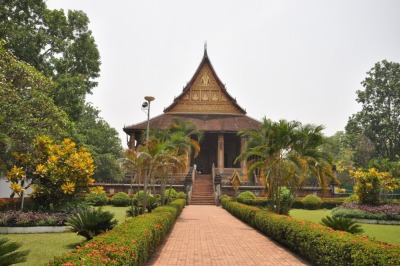 Of course it had about a half dozen Wats (temples), a stop at the local market where I bought fabric to make skirts (Lao women mostly wear long straight wrap skirts in beautiful unique designs), stupas, pagodas and even a walk along the Mekong (it is still honestly the Mekong – although hard to believe because I’ve mentioned it almost every day for 5 weeks) and the Patuxai. The storey behind the Patuxai makes me laugh. The USA donated a bunch of cement in 1969 to build a new airport. Instead they partially built the Patuxai, an ugly cement version of the Arc de Triomphe. It was never finished due to country turmoil. You can pay a whole 40 cents to walk to the top and are rewarded with striking views of Vientiane. (James’ Note: I’m pretty sure the original Arc didn’t have gift store on the top three floors) We finished our tour at Pha That Luang. A giant, golden stupa that is the most important national monument in Lao. Legend says that missionaries from India erected it here to enclose a breastbone from a Buddha. Construction began early in the 3rd century and has continued so today it is surrounded by temples and gardens. It is a shiny sight, that’s for sure!