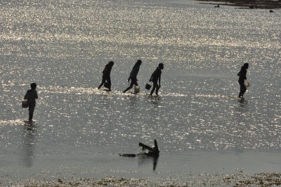 | Com beach, collecting crabs at low tide |