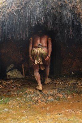 We were headed to a families “house”. It was called the Napas Village and was where this family have lived for generations. The land gets passed to the eldest son who gives his brothers a plot on it. It’s more a small compound with only one way in, through a wooden fence with a tiny door. When you walk in there are two paths; one to the men’s hut that women and children aren’t supposed to use and one that will bring you to the rest of the compound. The rest of the compound has the women’s and children’s huts and, in this case, the brothers wife’s hut. All is surrounded by mounds of vegetables, fruit trees and flowers. It was very organic and green. We were given a welcome by the man whose land we were on and then invited into the hut. Even I could go. We walked through a small door into a dark smoky, low ceilinged room. It was actually divided into two, the front being where they sleep and cook over a fire. The ceiling was dripping with some sort of black residue from the fire that went all day and night. They had no furniture and almost no belongings. They had a few clothes, bark to lie on, some arrows…not much. This was pretty cool. This is how these guys, four men, lived – today! Beside the fire were a couple of sweet potatoes (a staple in their diet) they’d picked fresh from behind the hut. Can you imagine; you get hungry so instead of the store you walk behind your hut and pick something.