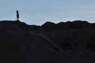 We slid down the soft sanded slope and asked the guide if we could walk back. He said we’d get the boat to the hot spring and then could walk. So we climbed in and were paddled slowly around the bay as our guide walked again…and beat us there again. Too funny. The hot spring was hot, boiling hot, so James just snapped a few pictures and we walked on. And on, and on, and on…it felt like we were walking through a black sand desert. I know it was only about 15 or so minutes but the sun was high and hot and it bounced off the sand getting us from the top and bottom. The wind also whipped a blast of the hot stuff in your face every now and then. There were a few bamboo lean-tos with a guy in them. We were told they were the land owners and charged $2.50 to take pictures of “their” hot spring. Hmmm…would have been nice to know before we took them. The guide said to lie and say we didn’t but we couldn’t. If he owned the land (we gave him the benefit of the doubt) and sat all day under a bamboo lean-to for the few tourists a day…then all the power to him. It was very obvious this land wasn’t good for anything, and wouldn’t be anytime soon.