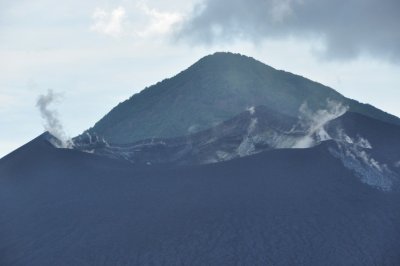 We met our guide in the lobby at 8 am and climbed into the van that we were told we still had to take. We drove to Matupit ( a tiny island a few minutes from the hotel) that, thankfully due to the wind, almost got off scot free when the volcanoes erupted. From the centre of the tiny town we walked to the ocean. As we walked locals joined us so by the time we climbed into our small banana boat we had a crowd of spectators. All friendly and just curious. The boat ride was peaceful and did offer specular views of the cranky Tavurvur Volcano but watching our guide walk along the shore and beat us to the other side made James a little cranky as well. We were advised (by the hotel staff and the guide book) not to climb the volcano but our guide (and his brother and the boat man) just started to hike up…so we followed. Now it was my turn to be cranky. I thought we were doing a nice easy walk around the base and skipped breakfast; not the smartest thing before hiking up a volcano! It wasn’t far, just really hot, and seeing the crater was worth it. What a sight. A steamy, stinky, massive crater that was about a half mile across. We hung out and took it all in while our guide told us the story of the Japanese man who fell in and boiled, there used to be a boiling lake in it. Regardless, I moved a bit back from the edge. The view of the surrounding area was just as amazing. Leading away from the volcano was a black sand “desert” zone that had a few trees and green spots. In the distance lush green mountains, including 4 other volcanoes, surround the tiny town of Rabaul.