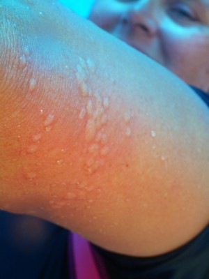 During the safety stop in the first dive, as I was hanging on the rope doing my little underwater yoga, a jelly fish (the kind in a long string) wrapped around my arm. I screamed and started to frantically shake my arm. It felt like cigarettes were burning me everywhere the little red heads touched me. I got it off and the guide, who was right beside me, saw it immediately. He started to flick it with his tank banger trying to break it up. The Whitehorse guy was floating close by but with his face down with his shaved head pointed right in the direction the jelly fish was moving. I swam towards him and started to push him out of the way. He looked up startled and gave me a weird look. He turned to the dive guide and I’m sure wondered what the heck he was doing waving frantically at nothing. He didn’t see it. I had tears in my eyes for the rest of the stop. When we surfaced James asked what had happened. I tried to explain without crying. It really hurt. It was on fire. On the boat the guide gave me some vinegar to pour over it and it helped a tiny bit. Everywhere those tiny heads had touched I had a welt that was swelling as we watched them. It actually stung me through my bathing suit. The pain and fire feeling subsided but didn’t quite go away. When I hit the water for the second dive it stung really bad but by the end of the dive was feeling better. The swelling had gone down and all that was left was red dots. The amount of pain I felt I figured it would be weeks. The funny thing was that I still had the rash from the last time a hydroid got me. Diving is painful.